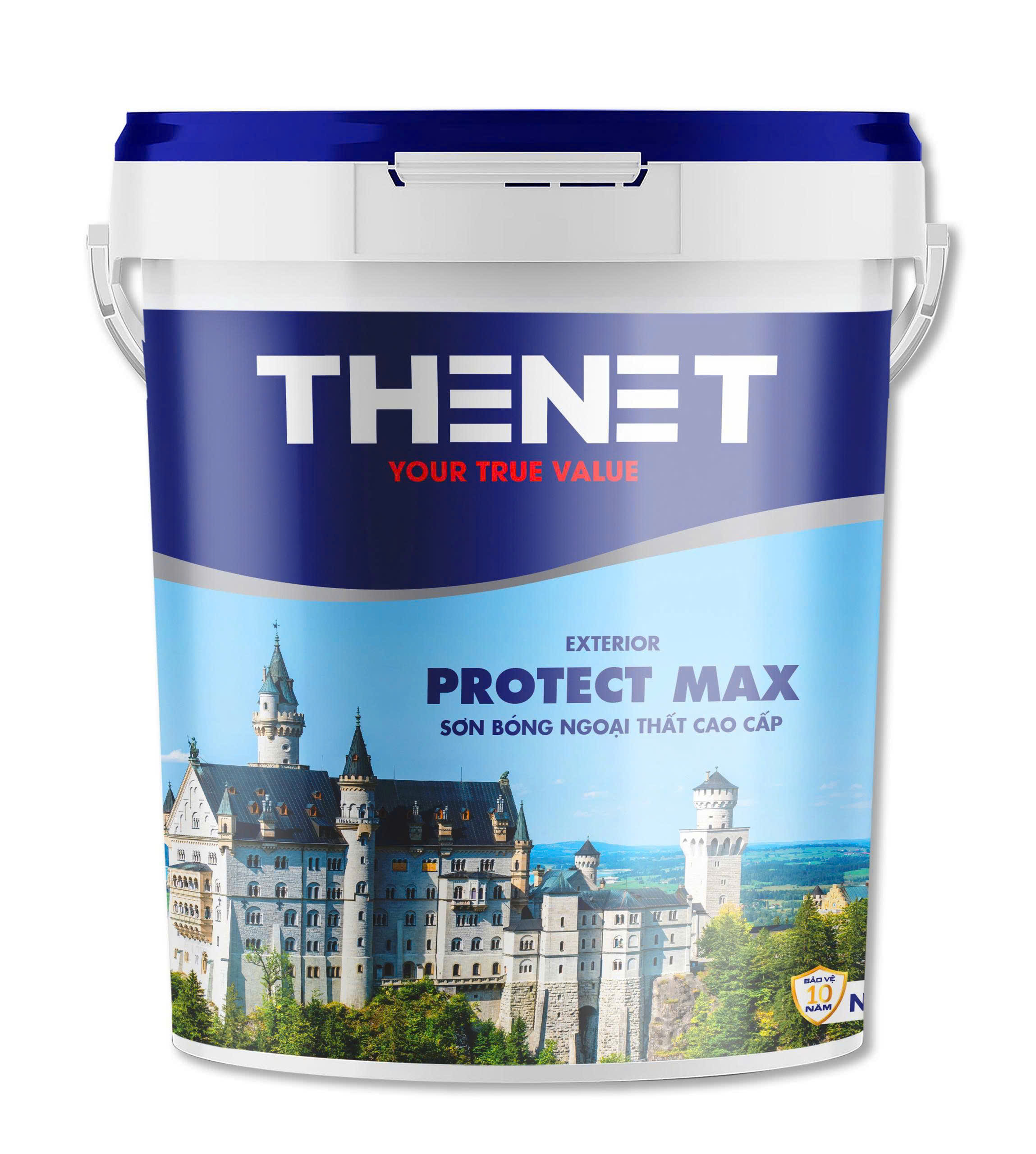 sơn ngoại thất thuộc thương hiệu “THE NET” với slogan “YOUR TRUE VALUE” được in nổi bật trên nền xanh navy đậm. Sản phẩm mang tên “PROTECT MAX” và có dòng chữ tiếng Việt “SƠN NGOẠI THẤT BÓNG CAO CẤP” bên dưới, cho thấy đây là loại sơn chuyên dụng cho việc sơn bên ngoài công trình với độ bóng cao.